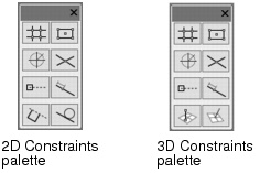 1. If the Constraints palette is not open, select Window > Palettes > Constraints.The Constraints palette opens. The last two tools on the palette are different depending on whether a 2D or 3D tool is currently active.